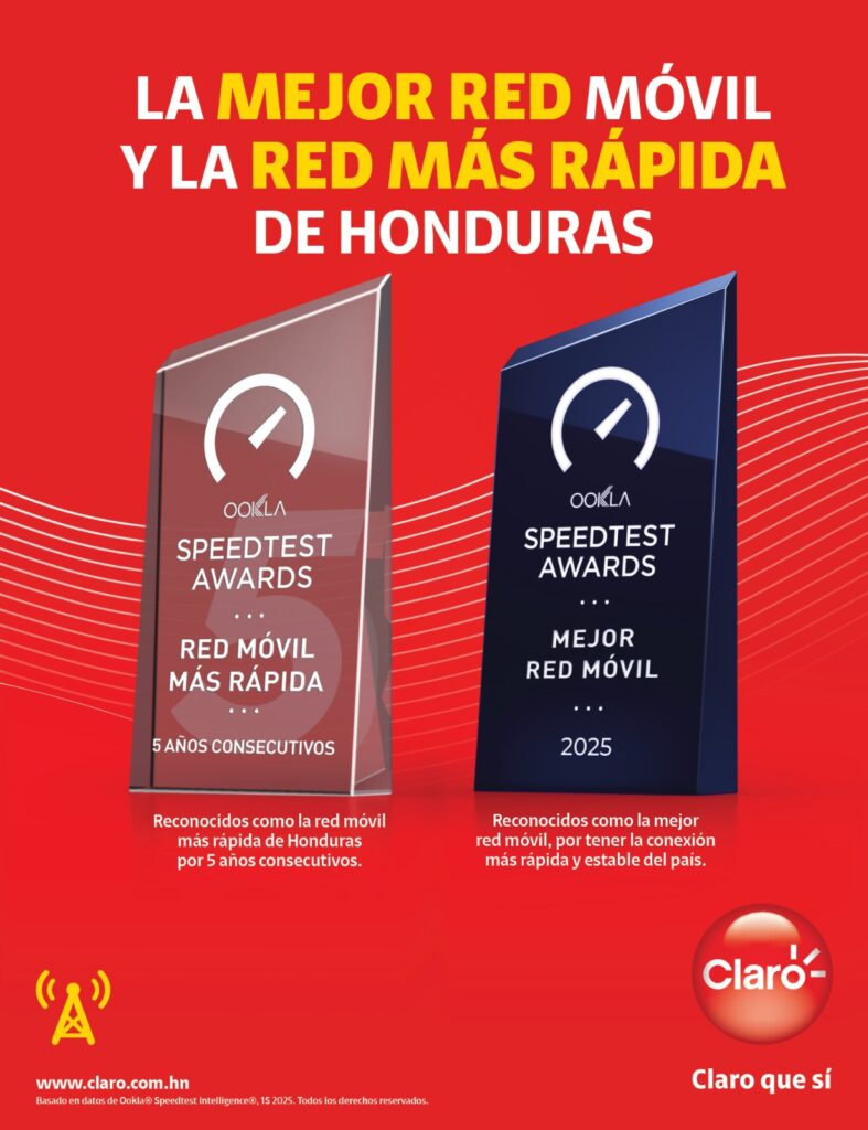 Honduras, 22 de septiembre de 2025.- Claro Honduras es reconocida nuevamente por Ookla, líder mundial en aplicaciones de prueba, datos y análisis de internet, al obtener por quinto año consecutivo el premio a la Red más rápida de Honduras y el reconocimiento a la mejor red del país, de acuerdo con los resultados de los Speedtest Awards.